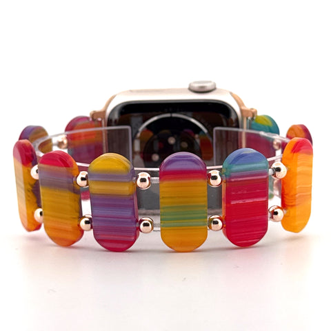 Q: Does the Rainbow Resin Stretch Bracelet fit all Apple Watches? A: Yes – it’s designed to work with every Apple Watch model and size.
