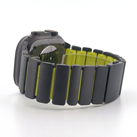 The black titanium outer links bring a sophisticated, durable finish that resists wear and tear, while the vibrant green silicone interior ensures a soft, flexible, and skin-friendly fit. It’s the perfect combination for anyone who values luxury aesthetics and functional design — ideal for both daily wear and intense workouts.
