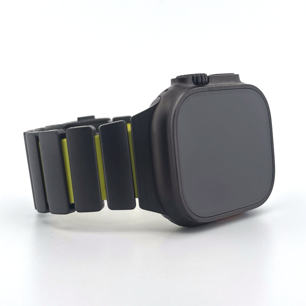 Add a bold pop of colour to your Apple Watch with the Hybrid Magnetic Titanium & Silicone Fusion Band in Black Titanium & Green. Designed for Apple Watch Ultra 1, Ultra 2, Ultra 3, and larger 44mm, 45mm, and 46mm models, this strap blends cutting-edge materials with premium comfort to deliver a modern, high-performance look that stands out from the crowd.