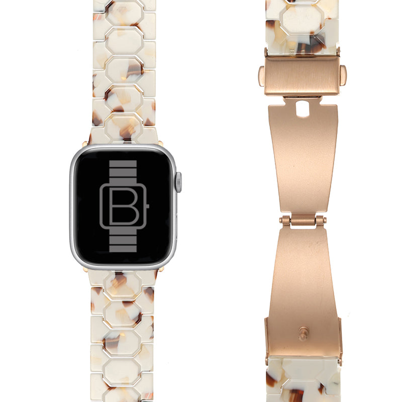 Refine your Apple Watch with the Nougat Resin Linked Bracelet, a sophisticated strap designed for those who value timeless elegance. Featuring a beautiful marbled blend of cream, beige, and brown tones, this nougat Apple Watch band adds warmth and subtle luxury to your smartwatch, making it perfect for both everyday wear and special occasions.