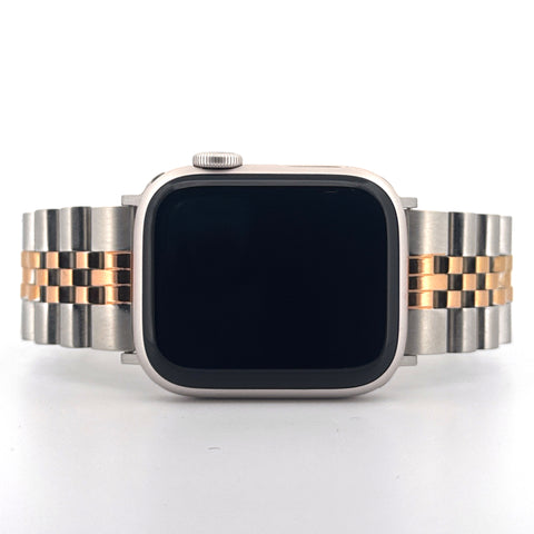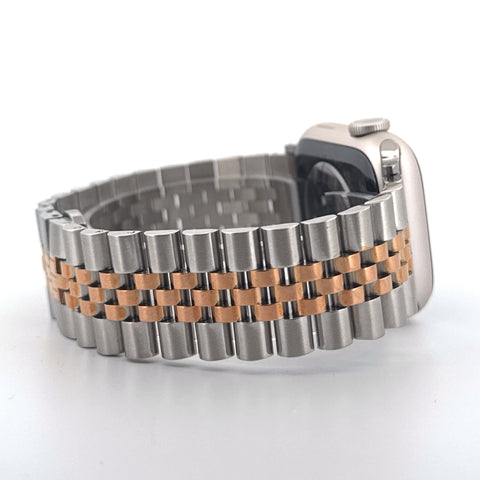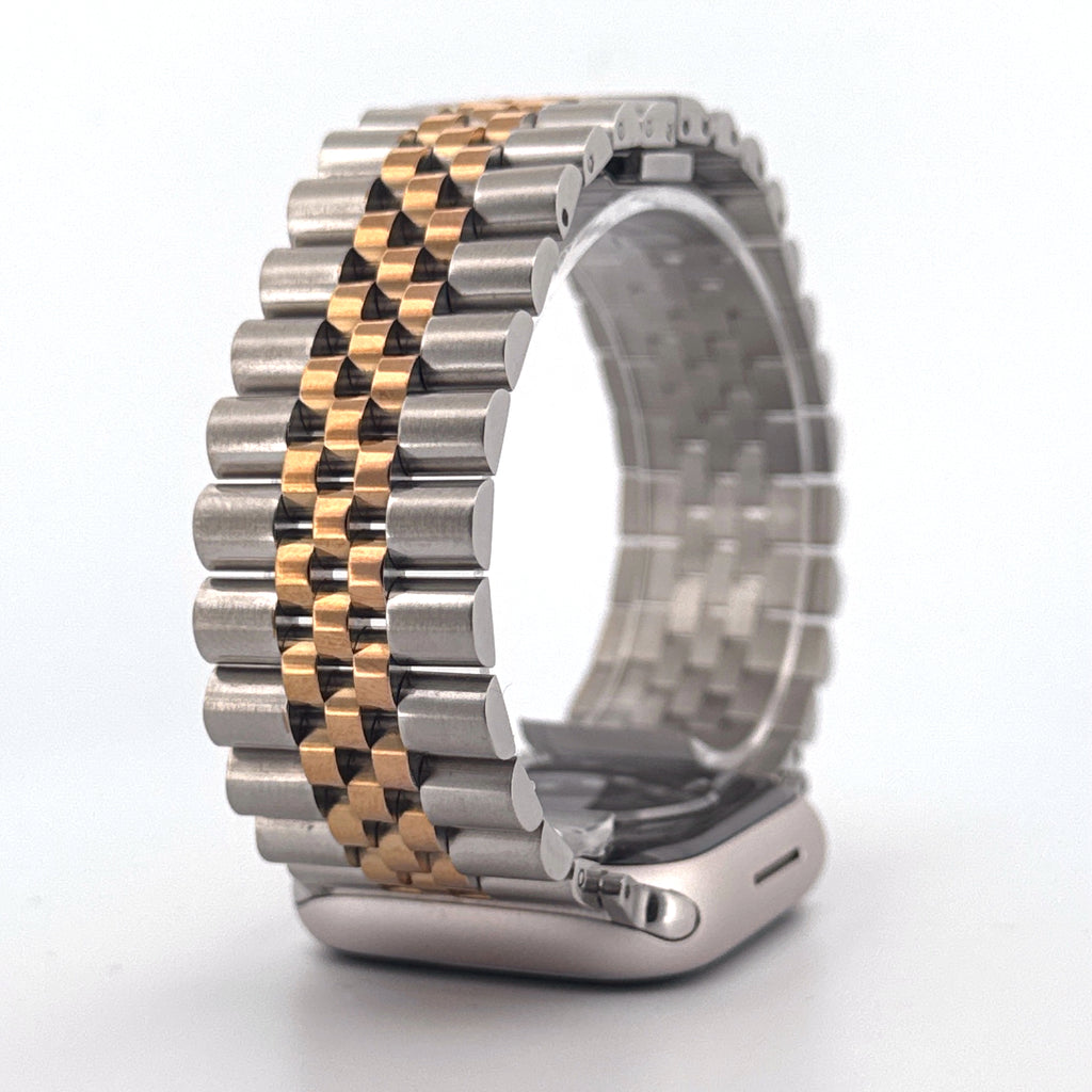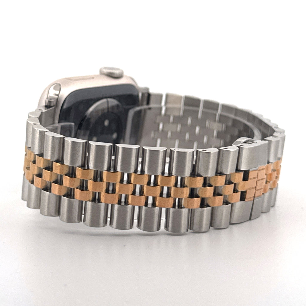 Easy to install, the band allows you to quickly personalize your Apple Watch and switch styles as desired. With its timeless design and high-quality craftsmanship, the Jubilee Stainless Steel Band in Silver and Rose Gold is an ideal upgrade that combines durability with sophisticated elegance. Make a statement with your Apple Watch and enjoy a perfect blend of form and function.