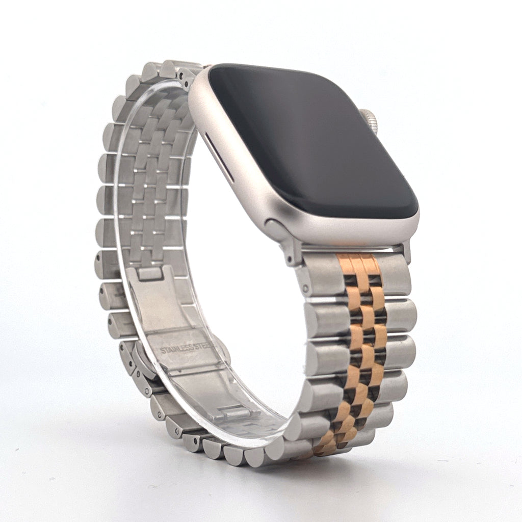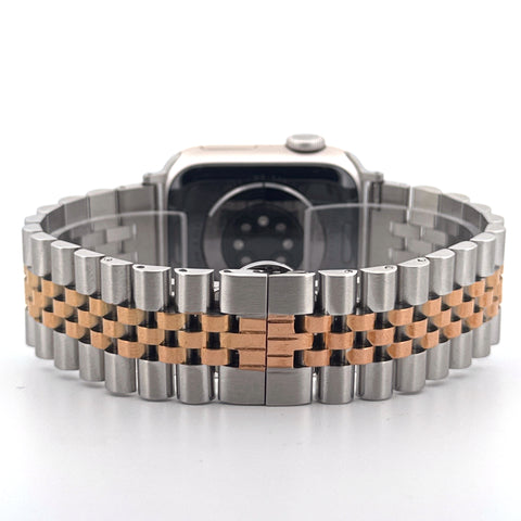Elevate your Apple Watch with the sophisticated charm of the Jubilee Stainless Steel Band, available in both sleek Silver and elegant Rose Gold finishes. Crafted from premium stainless steel, this versatile band combines durability with a refined aesthetic. The Silver option offers a contemporary, minimalist look perfect for daily wear, while the Rose Gold adds a warm, luxurious touch for more formal or stylish occasions.